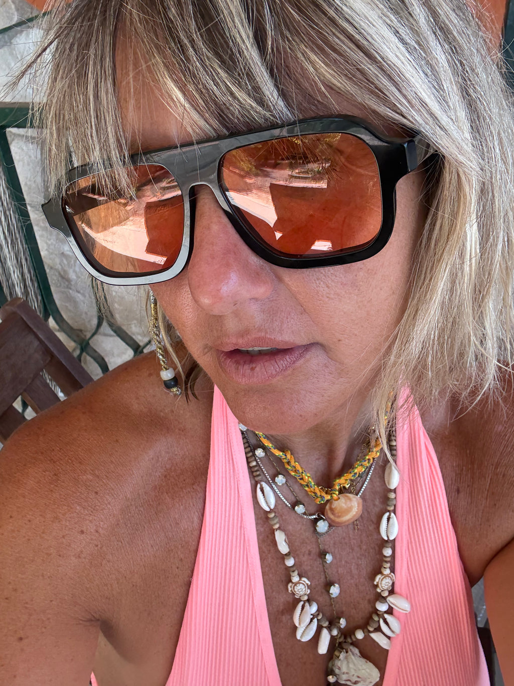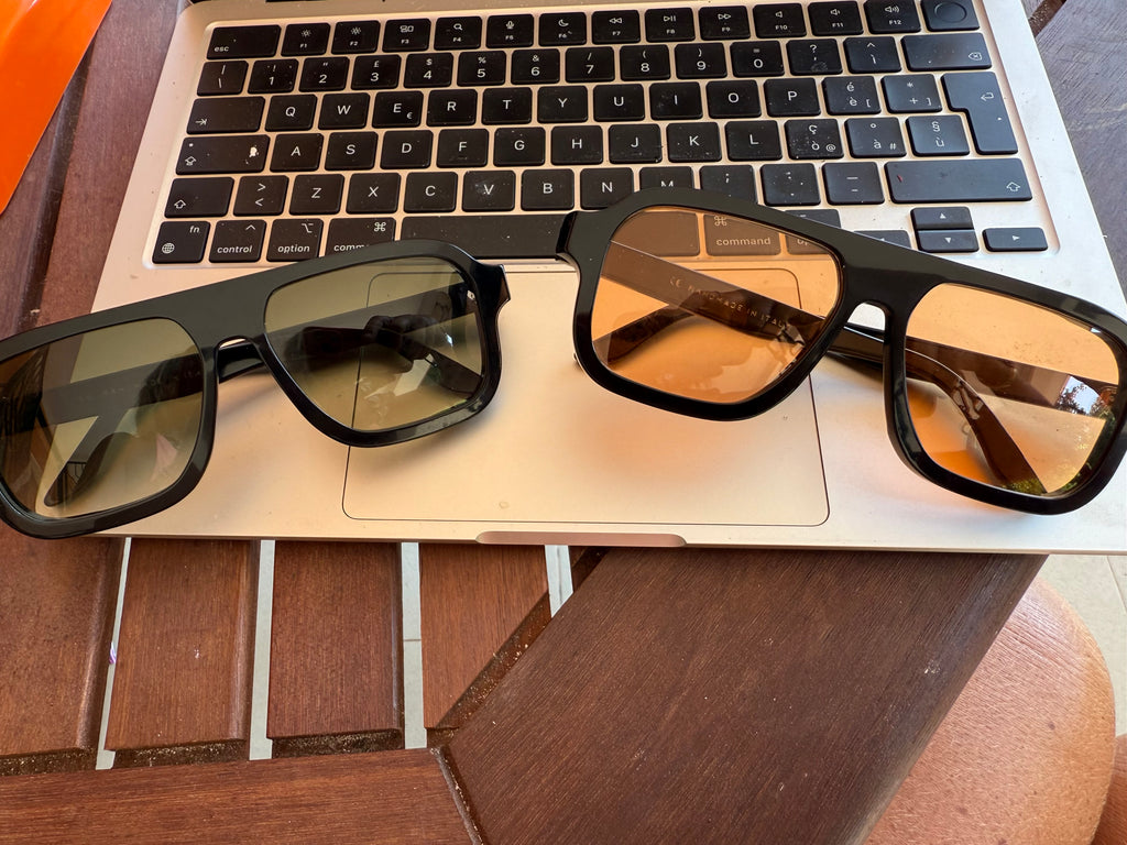 Occhiale in acetato color tartaruga bianca o dark tortoise, con lenti Zeiss di qualità certificata color celeste sfumato.