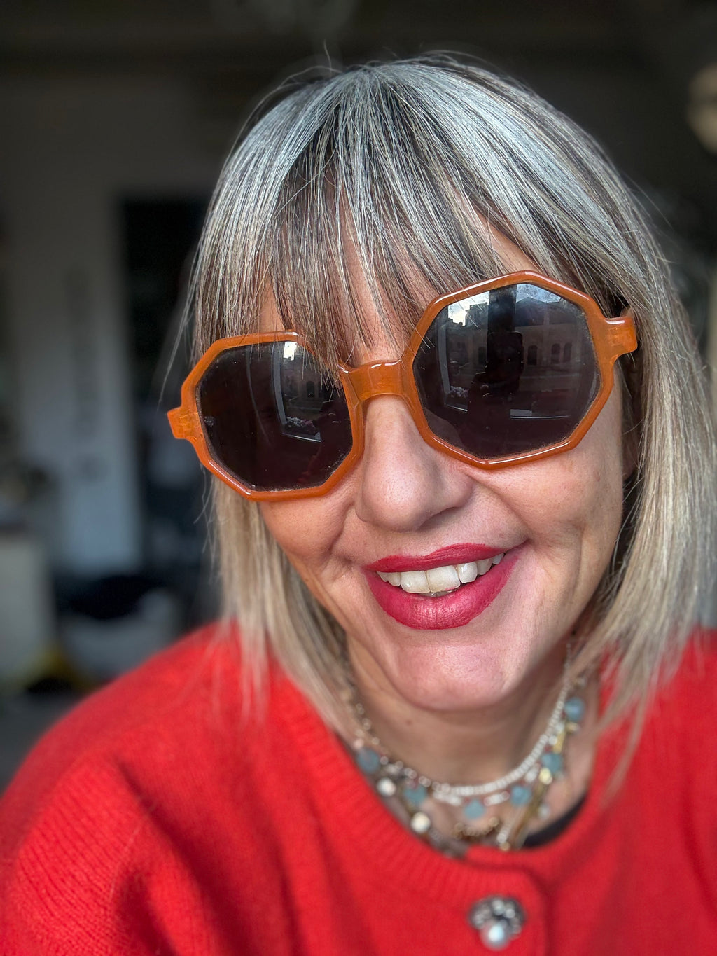 Eyewear in Italian red colored acetate with Zeiss grey/green UV400 lenses. All handmade in Italy.