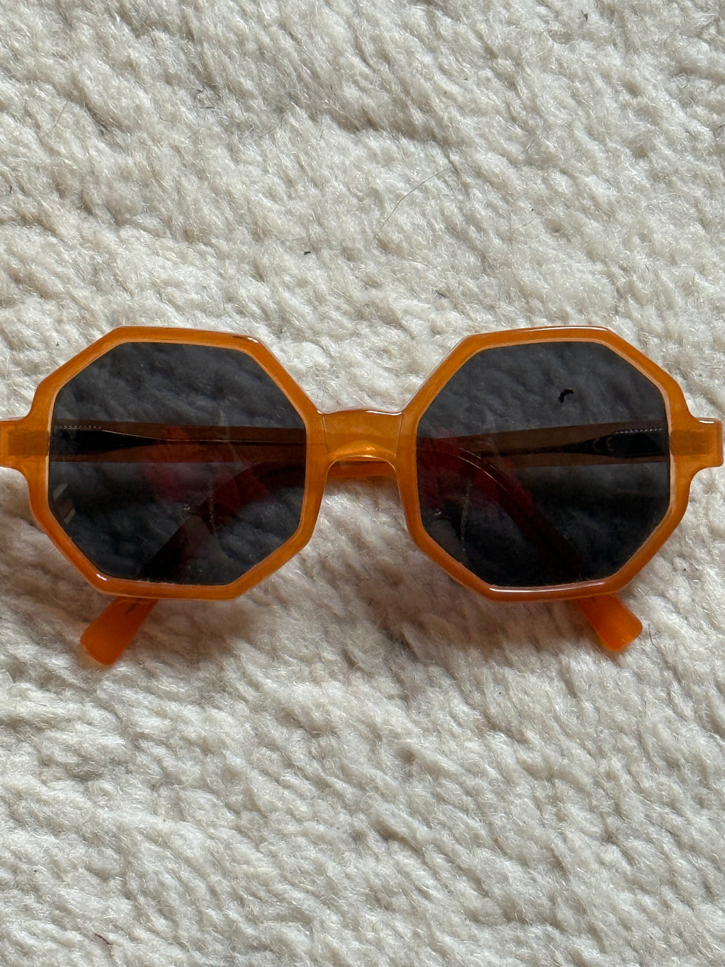 Occhiale in acetato color rosso, con lenti Zeiss di qualità certificata color grigio verde sfumato. Tutto interamente fatto a mano in Italia.