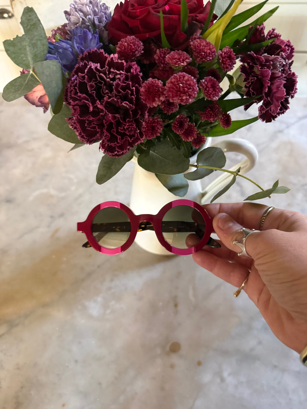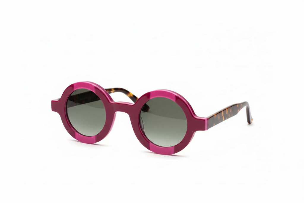 Occhiale in acetato, con lenti Zeiss di qualità certificata color grigio verde sfumato.