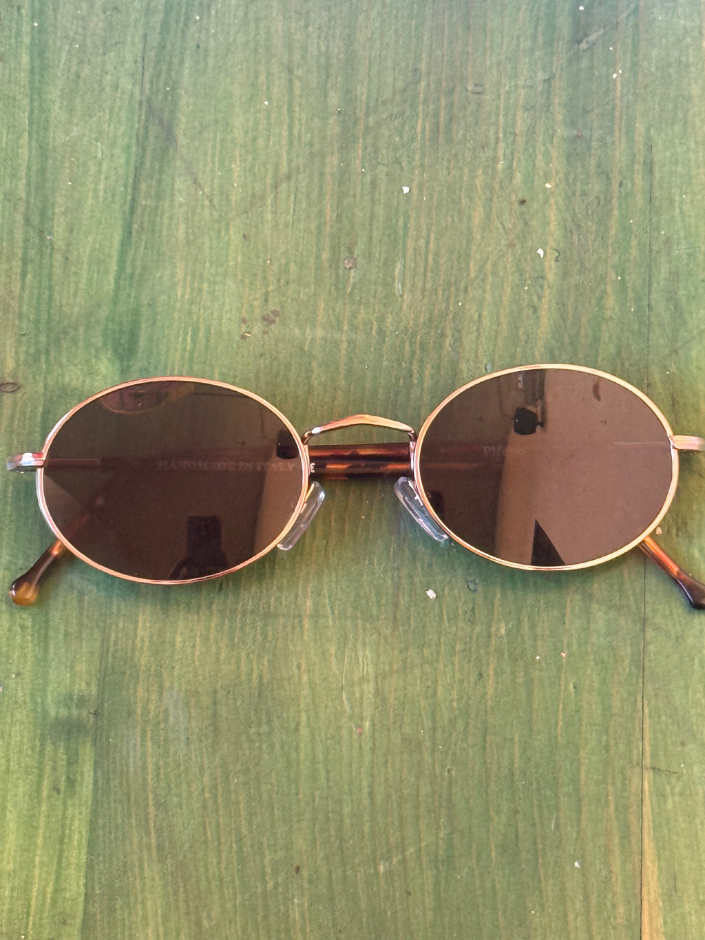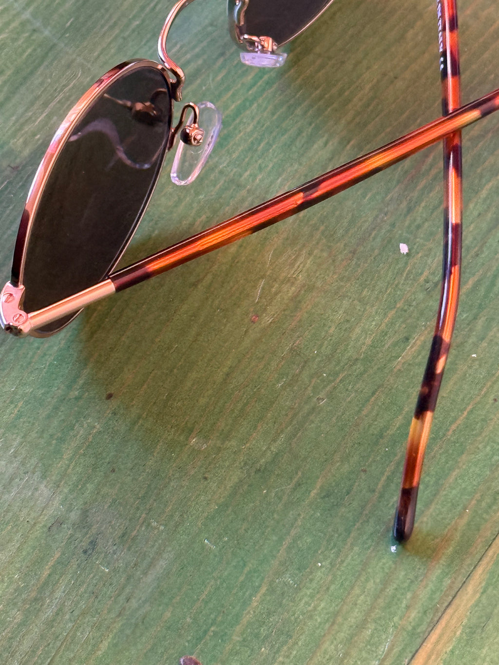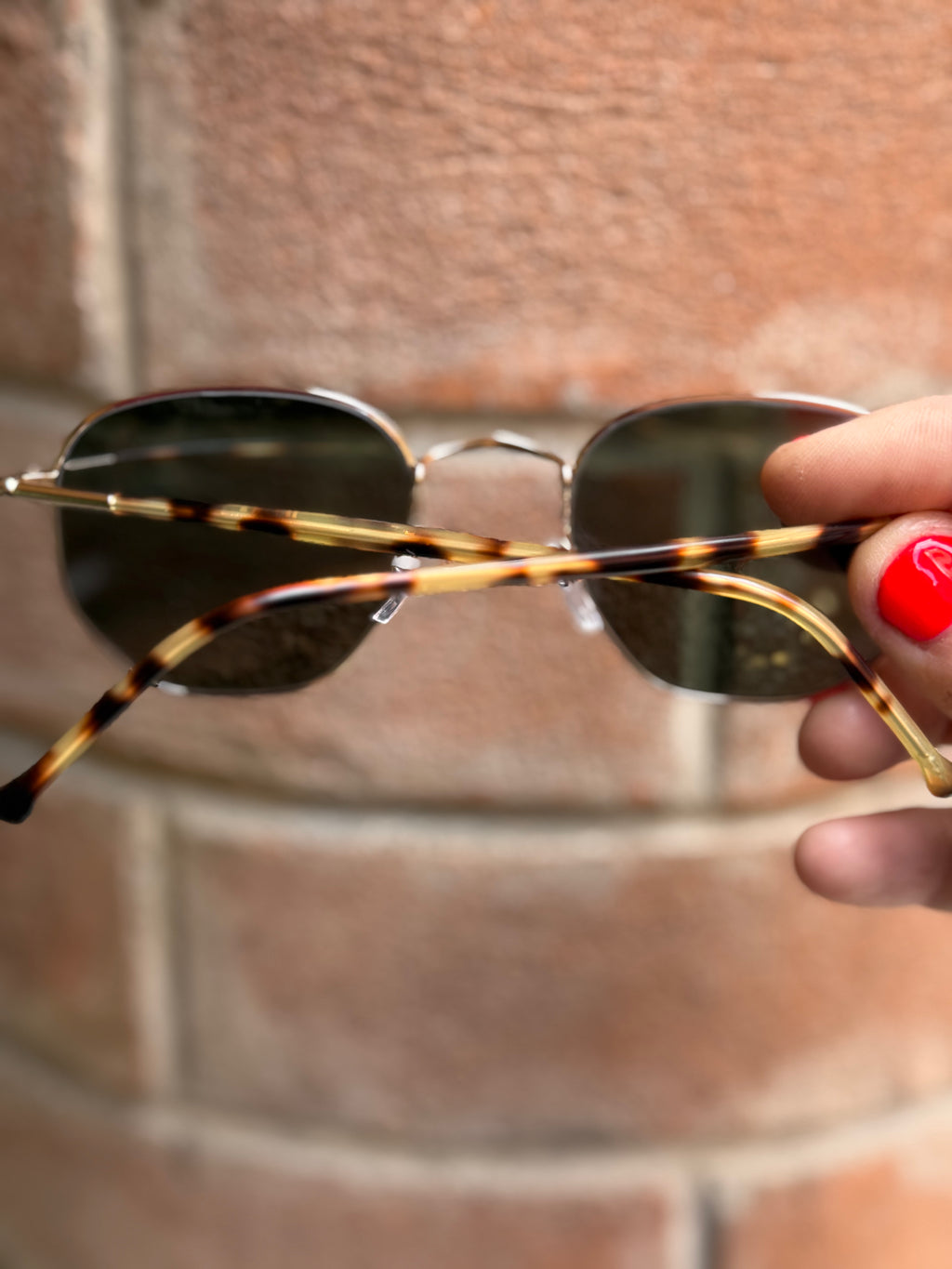 Occhiale in acciaio oro e asta sottile e molleggiata a cannuccia color tartaruga con lenti Zeiss di qualità certificata color verde bottiglia.