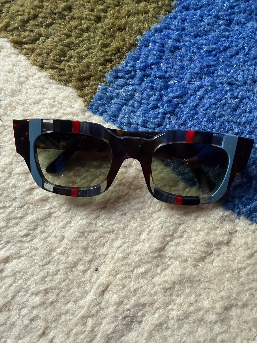 Occhiale in acetato , con lenti Zeiss di qualità certificata color grigio verde sfumato.
